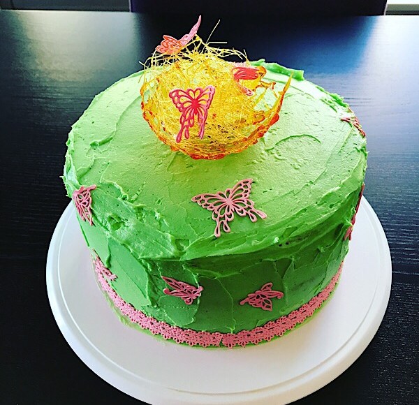 The picture at the top of this recipe is this chocolate cake recipe, three layers of chocolate cake with buttercream and salted caramel sauce on each layer. I decorated it with cake lace, which is edible and flexible with a caramel cage and spun sugar on top.