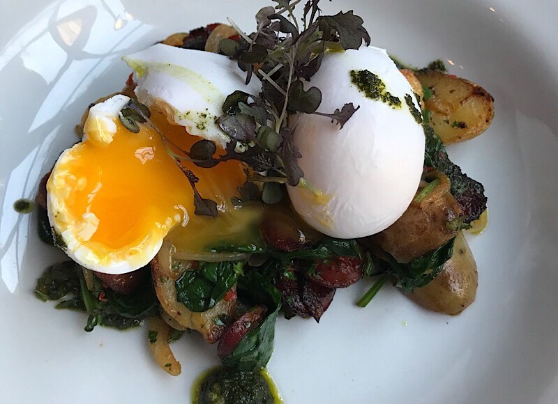 I arrived early in the morning so I dropped my bags off at my hotel (I’m staying at Hotel Indigo off of Paddington Station), then I walked over to a restaurant called, “The Grazing Goat” where I ordered sauteed new potatoes and chorizo. This dish came with two poached duck eggs and caramelized onions.